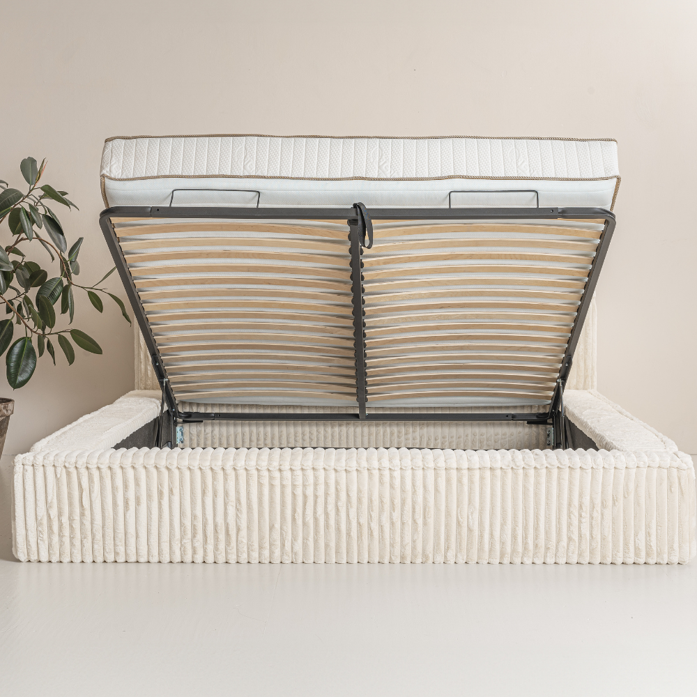 Deze boxspring biedt meer dan alleen slaapcomfort. Onder het bedframe bevindt zich een ingebouwde opbergruimte, ideaal voor het netjes opbergen van beddengoed, kussens of andere items die u uit het zicht wilt houden. De bedbodem, voorzien van een lattenbodem met opbergruimte, combineert functionaliteit met een stevig fundament voor het matras. Dankzij de hoogwaardige gasveren, die de opbergruimte ondersteunen, kunt u moeiteloos bij uw spullen zonder afbreuk te doen aan het strakke design. Dit ledikant is ontworpen om uw leven gemakkelijker te maken, met praktische oplossingen die vanzelfsprekend integreren in uw dagelijkse routine.